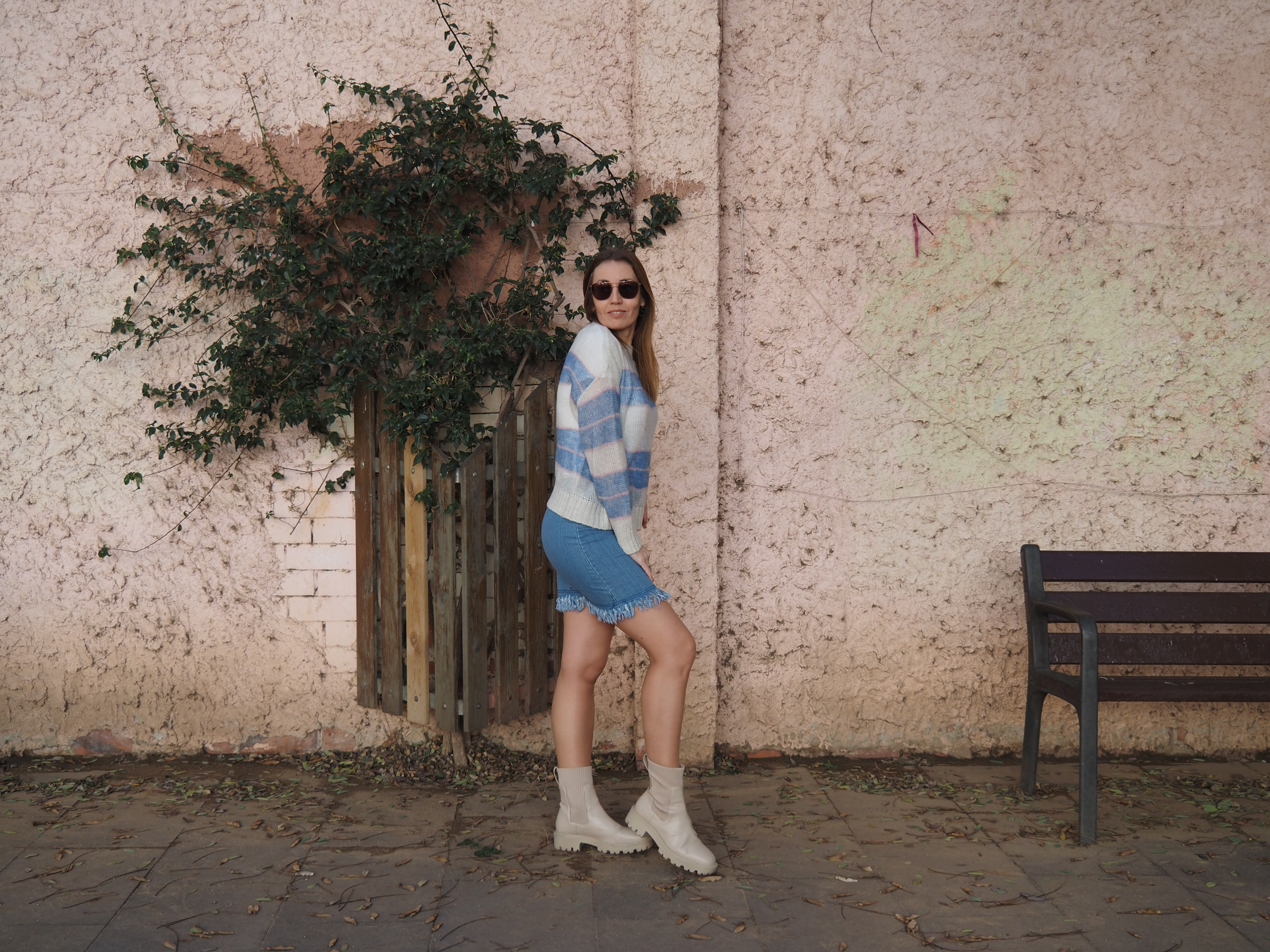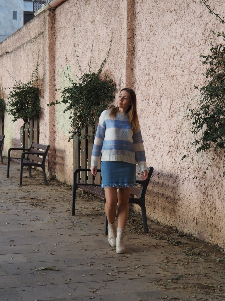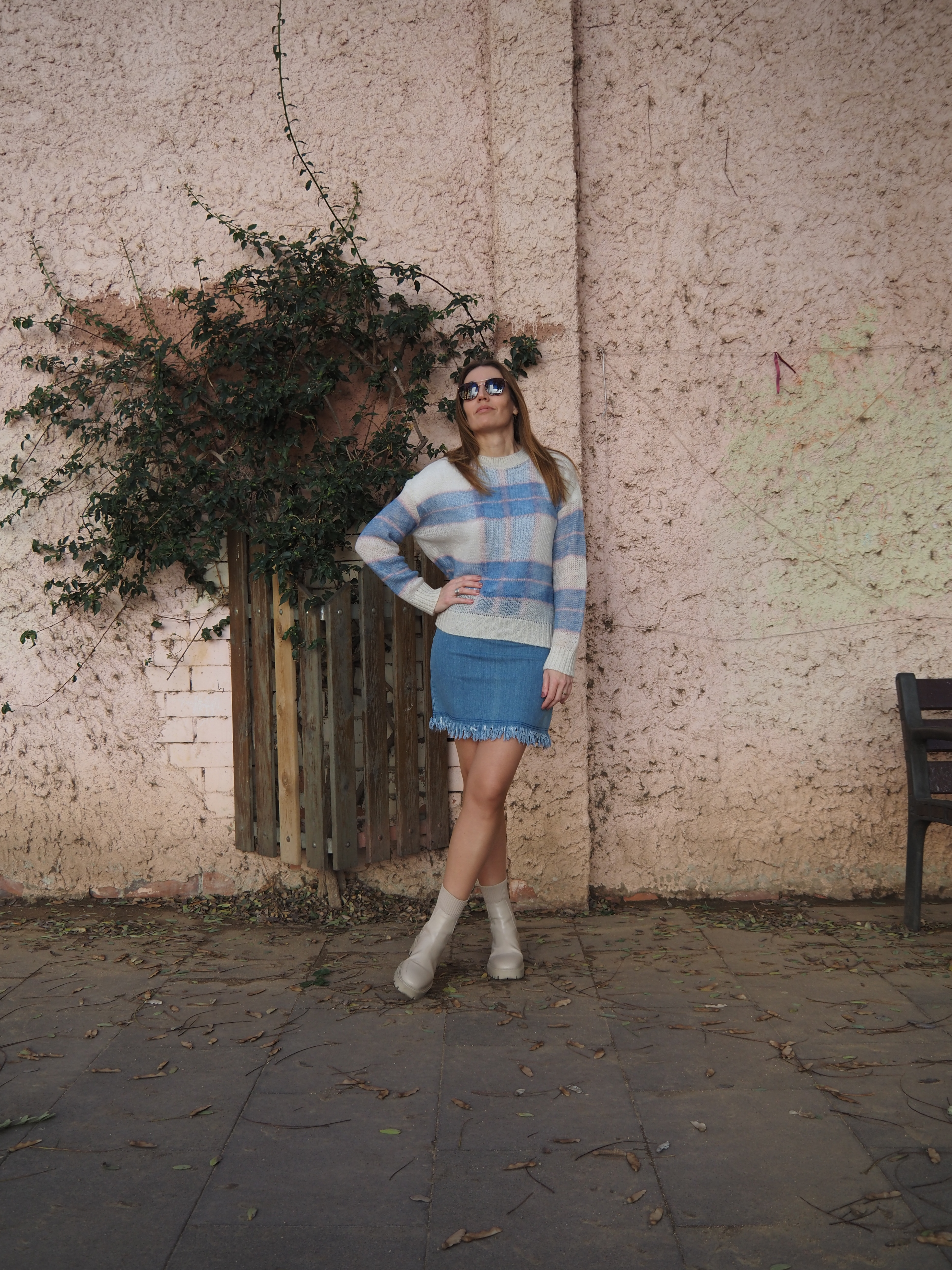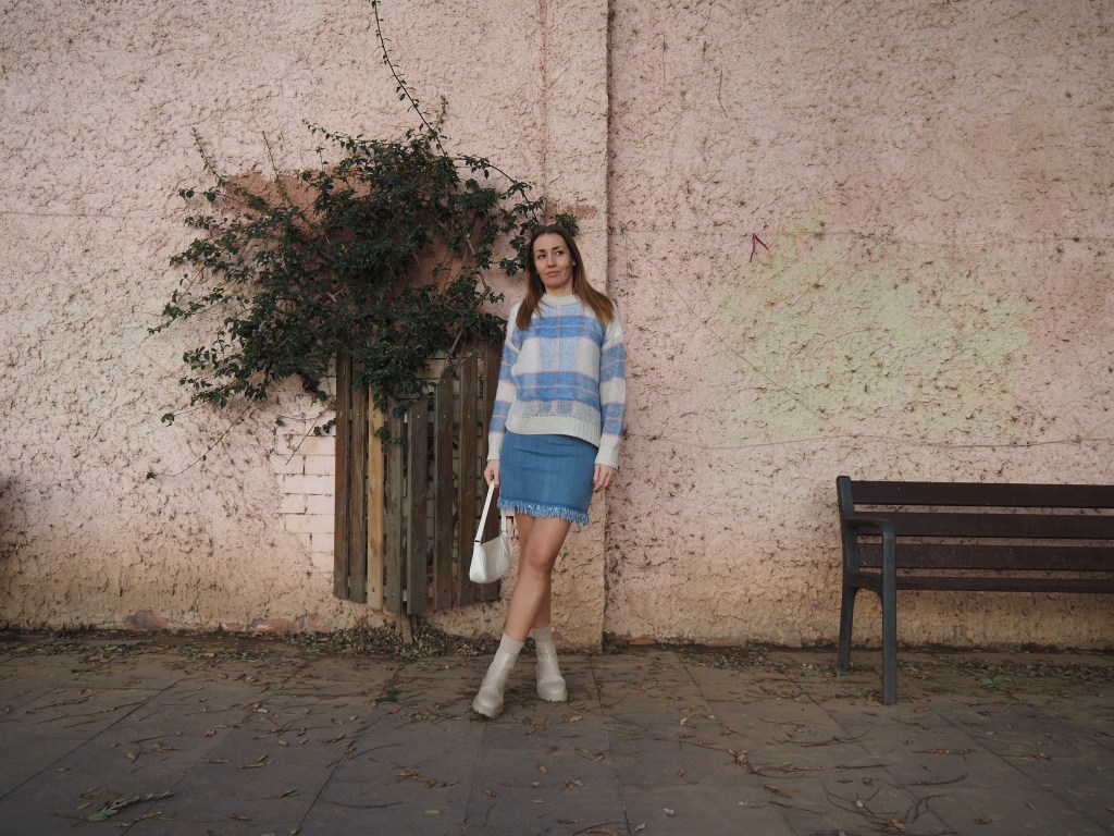 La combinación, como podrás observar, está formada por un jersey de lana muy fina en tonos pastel, una falda denim con el bajo deshilachado, y los botines y mini bolso en tono blanco roto.