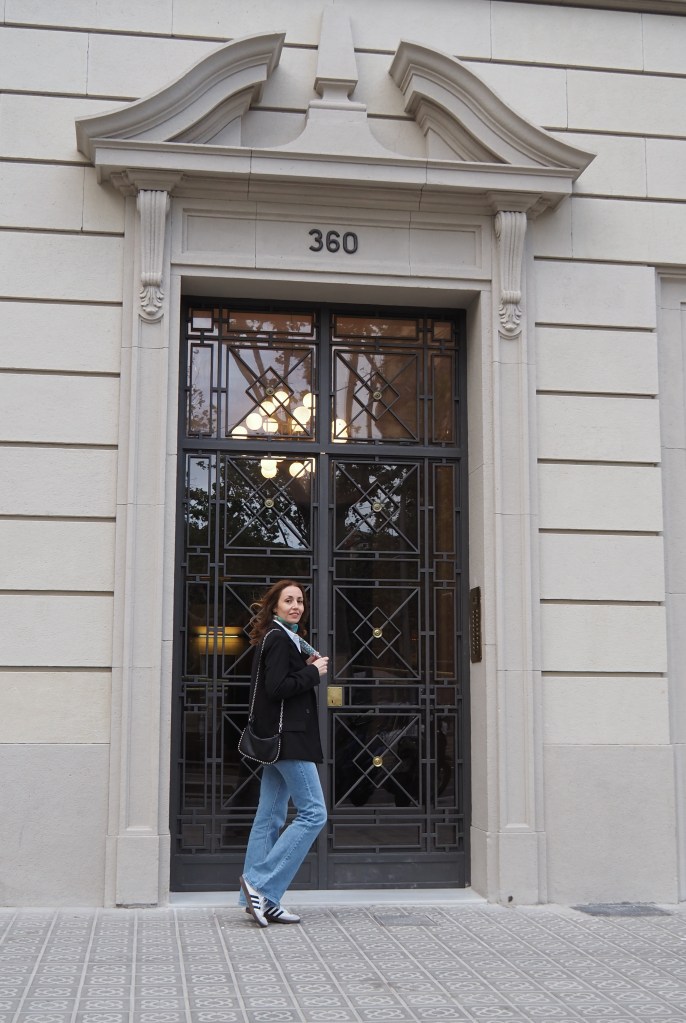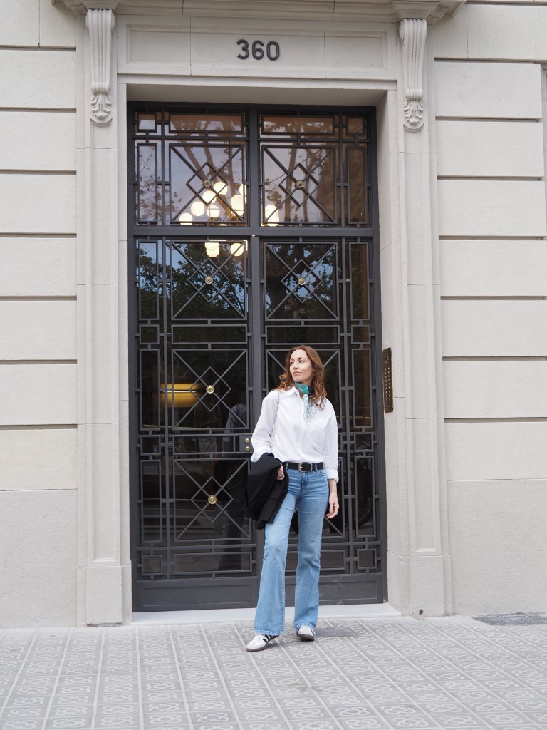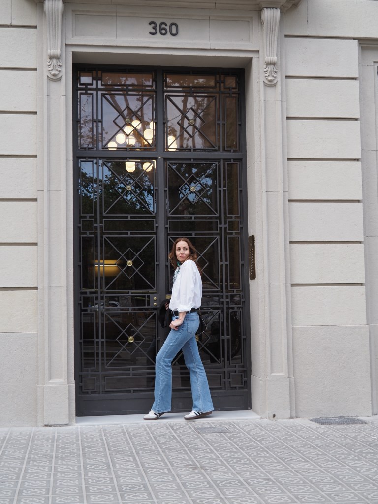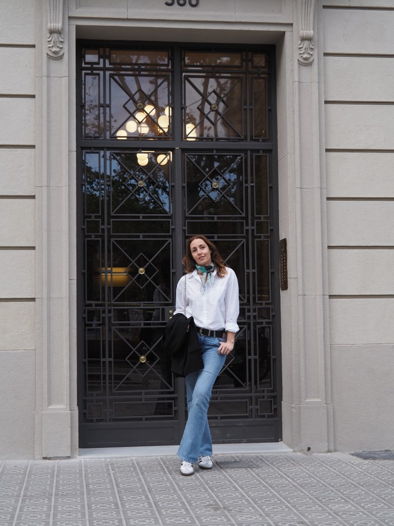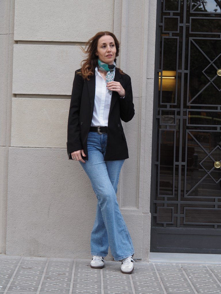 Como puedes observar en las imágenes, es un look bastante cómodo formado por varias prendas básicas o «fondo de armario». Combino unos «flare jeans» o vaqueros acampanados (que aunque era bastante reacia, he acabado volviendo a ellos), con una camisa blanca básica, una blazer negra, las zapatillas Adidas Samba y un pañuelo vintage que lo amo con toda mi alma porque era de mi abuela y cuando lo llevaba siempre le decía que me encantaba (cuando dejó de salir de casa me lo regaló <3).