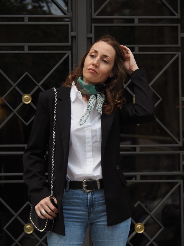 Outfit: Blazer de Zara (A/W 22-23), camisa de Stradivarius (S/S 24), jeans de Pull & Bear (S/S 24), pañuelo vintage, bolso de Brownie (A/W 22-23) y zapatillas Adidas Samba (S/S 23).