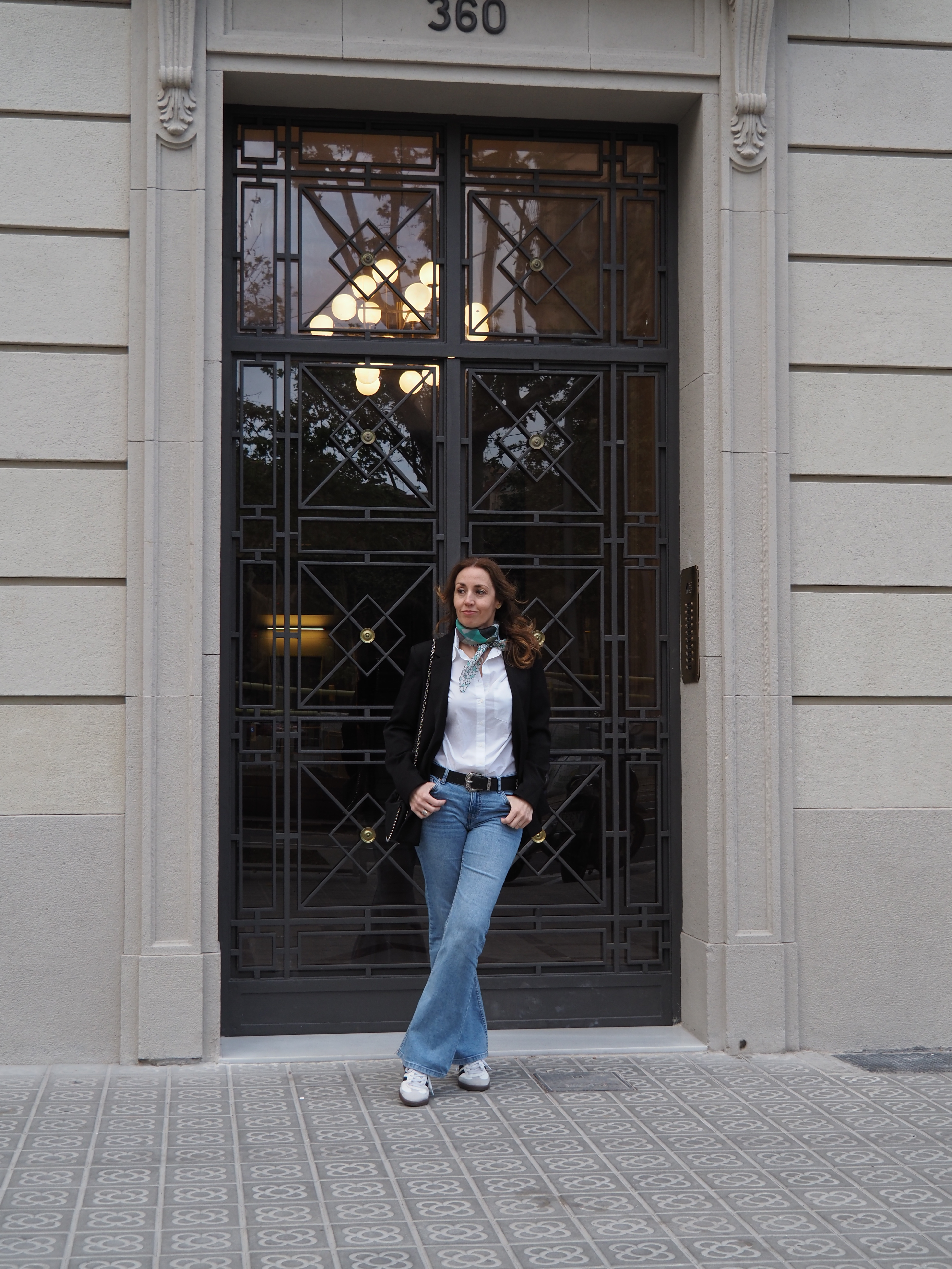 Como puedes observar en las imágenes, es un look bastante cómodo formado por varias prendas básicas o «fondo de armario». Combino unos «flare jeans» o vaqueros acampanados (que aunque era bastante reacia, he acabado volviendo a ellos), con una camisa blanca básica, una blazer negra, las zapatillas Adidas Samba y un pañuelo vintage que lo amo con toda mi alma porque era de mi abuela y cuando lo llevaba siempre le decía que me encantaba (cuando dejó de salir de casa me lo regaló <3).