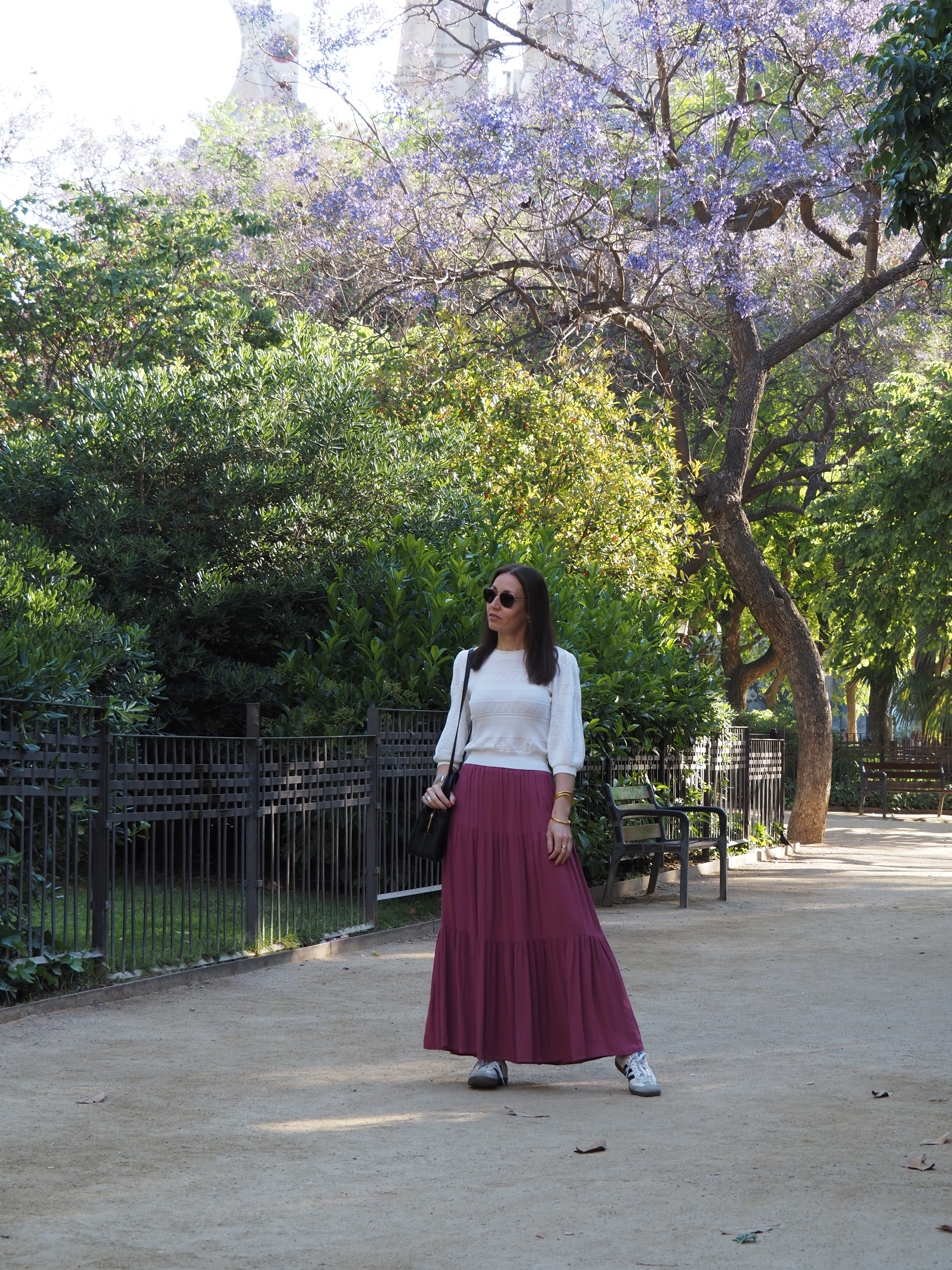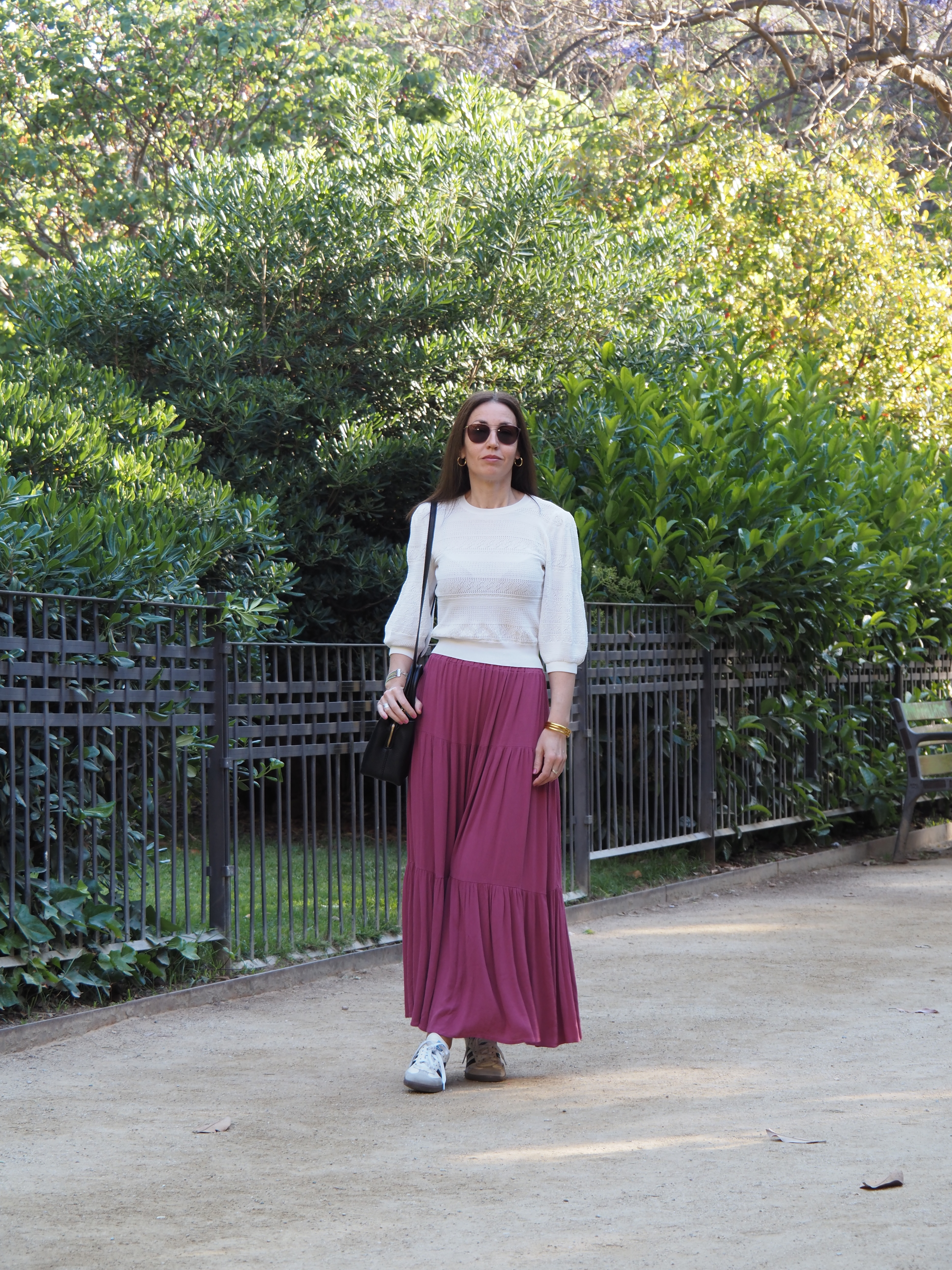 En esta ocasión la he combinado con un top blanco de mangas abullonadas (el mismo que combiné con vaqueros en el post anterior), un bolso negro y las zapatillas Adidas Samba para darle un toque casual.