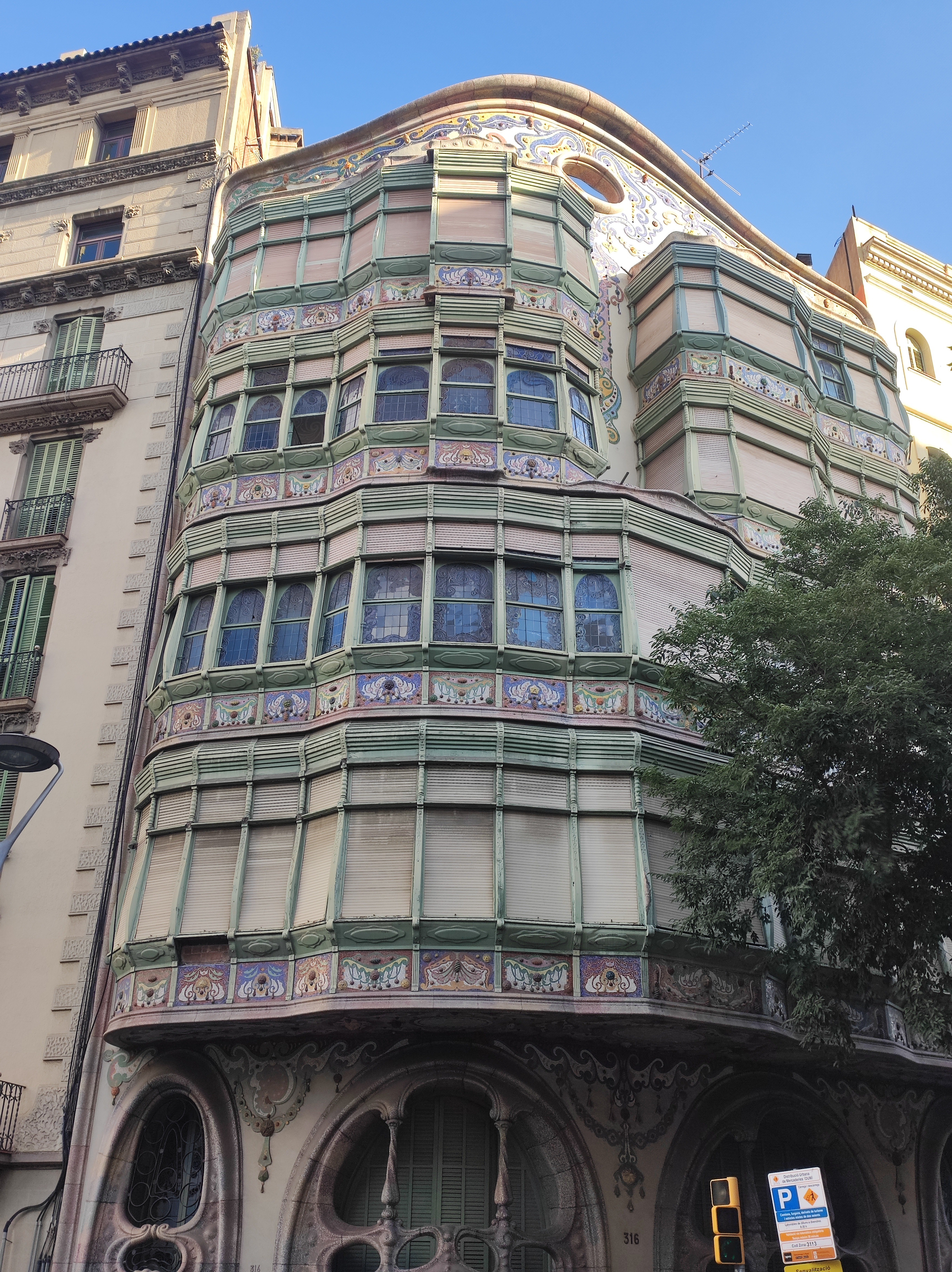 Por si todavía no conocéis este edificio modernista de Barcelona, está situado por una parte en la calle Córcega 316 y, por la otra, en la avenida Diagonal 442. Es de principios del Siglo XX y fue construida por el arquitecto Salvador Valeri i Purpurull, aunque la parte de la calle Córcega que está decorada a base de cerámica policromada, fue obra del artista Lluís Bru i Salelles. Es de propiedad privada y por lo tanto no se permiten visitas turísticas en su interior.