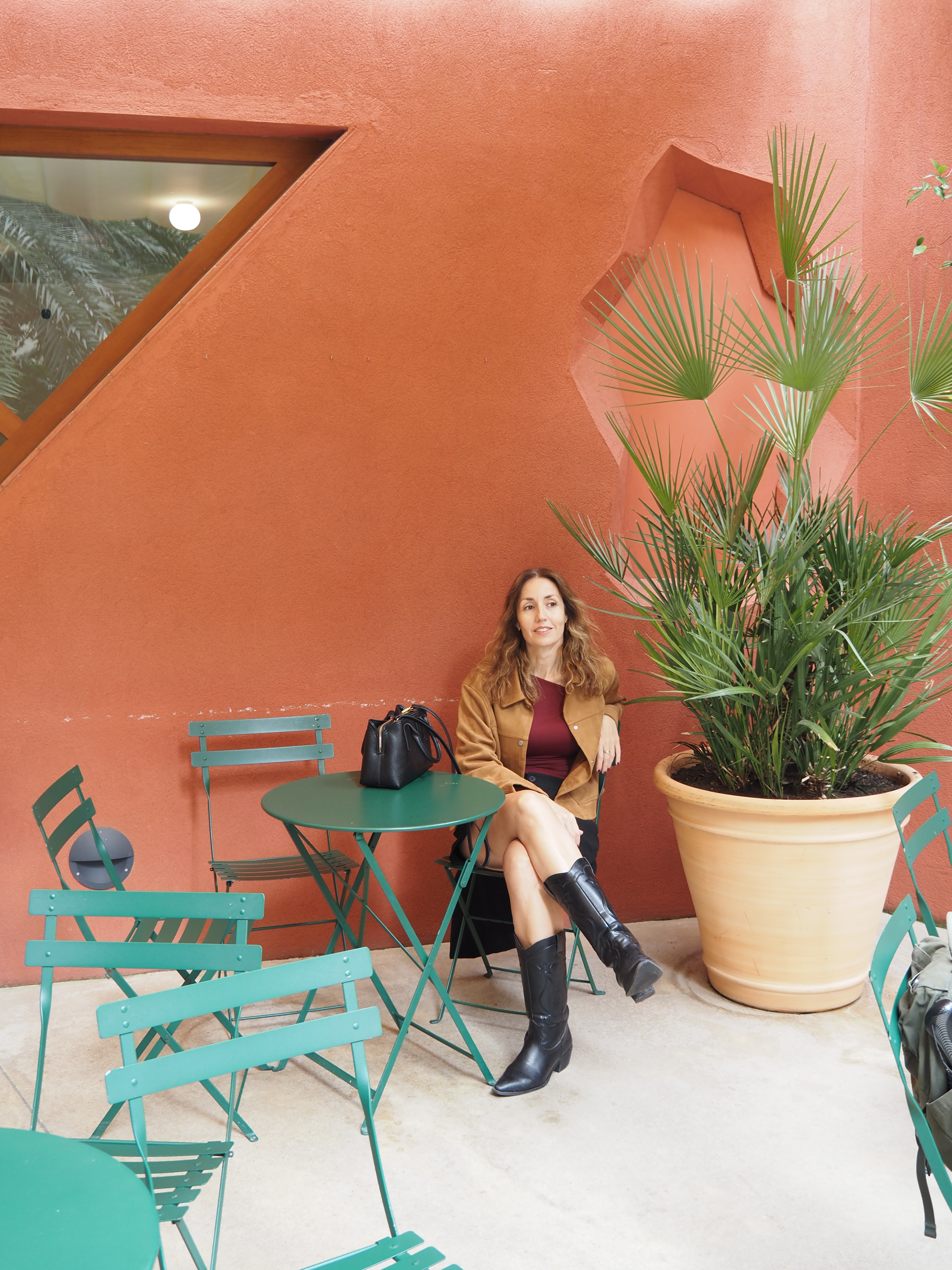 En cuanto al look, ya se percibe otoño tanto en la combinación de tonalidades (burdeos-marrón-negro), como en el uso de prendas aparcadas hasta ahora a un segundo plano (la chaqueta de ante y las botas cowboy negras).