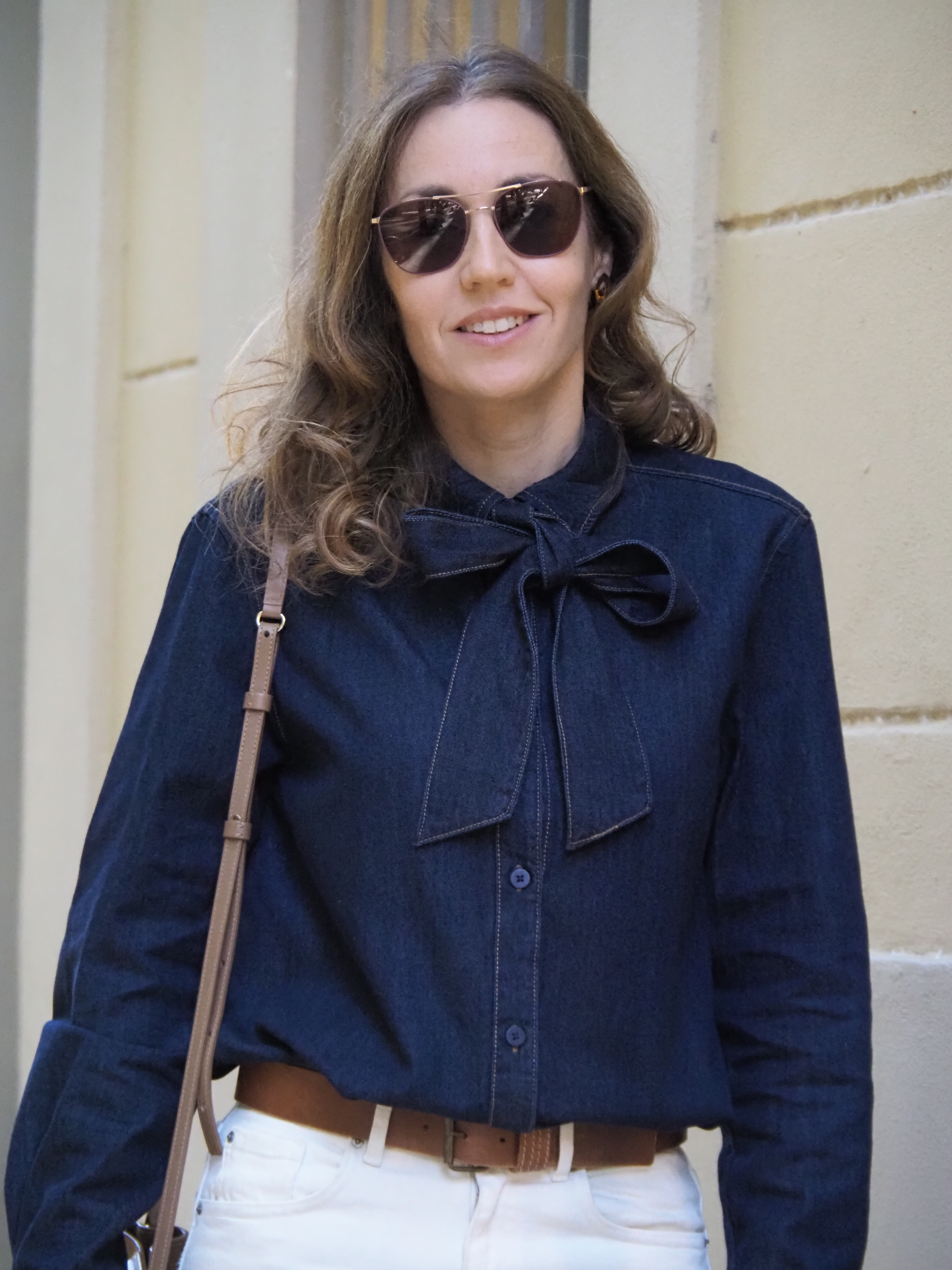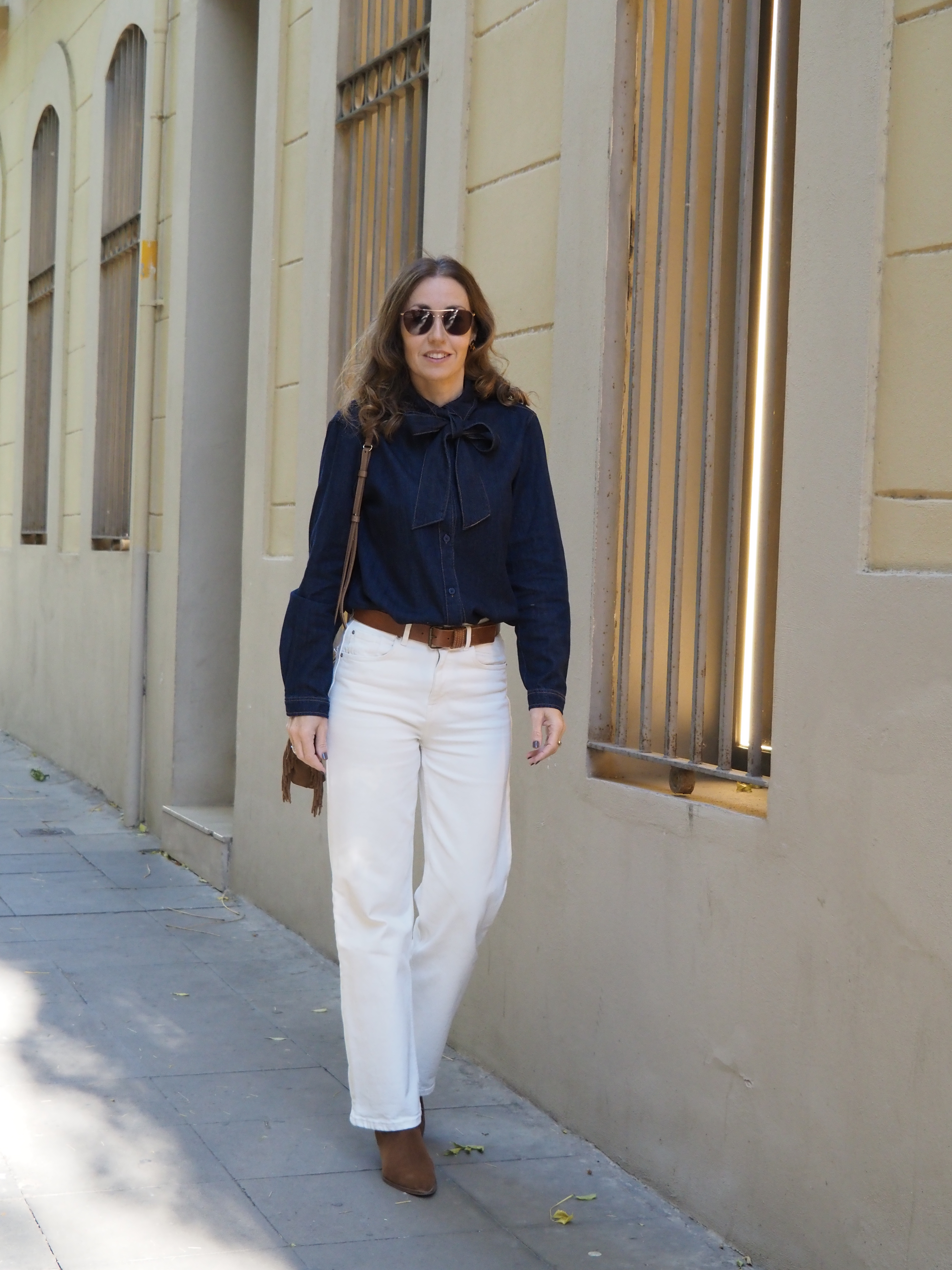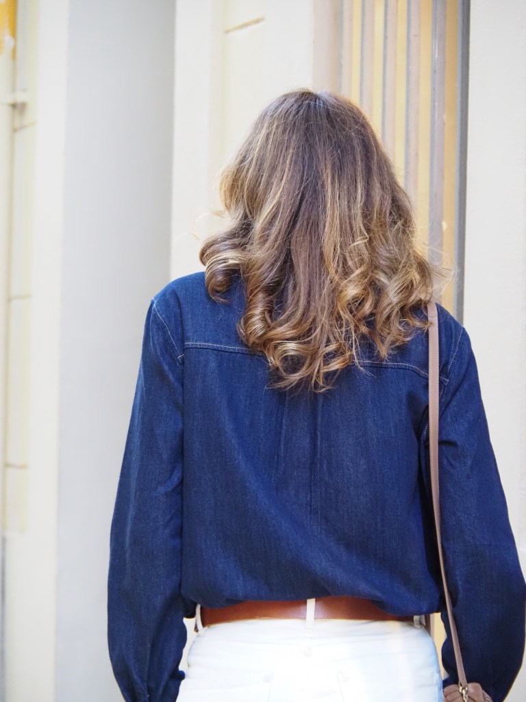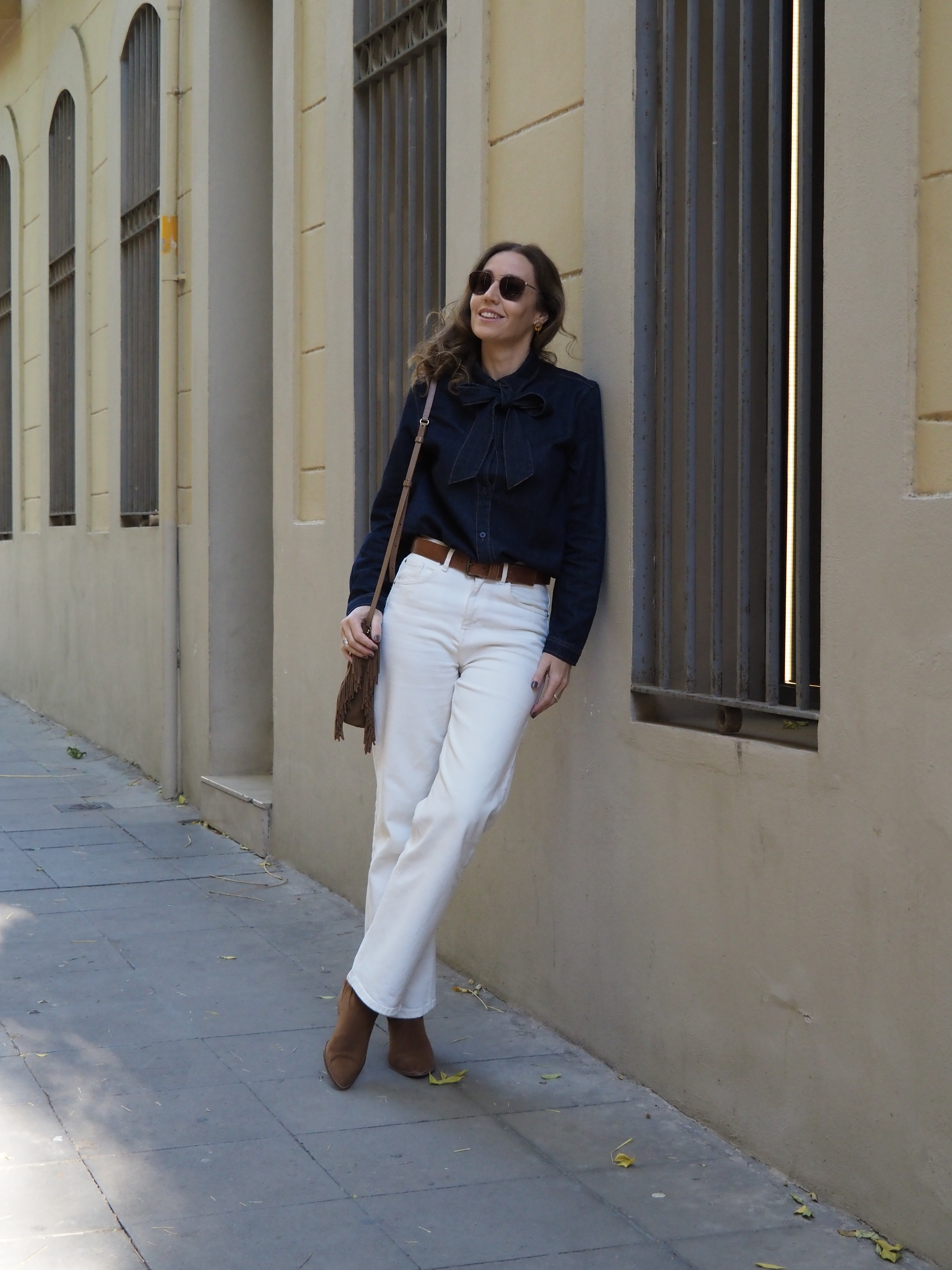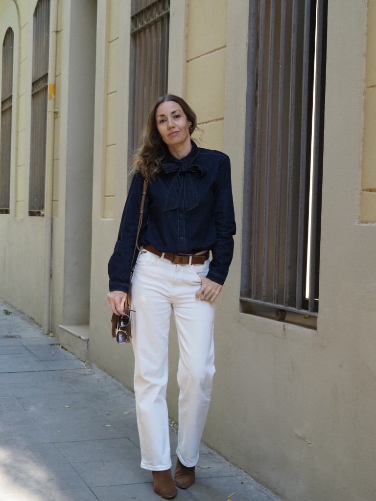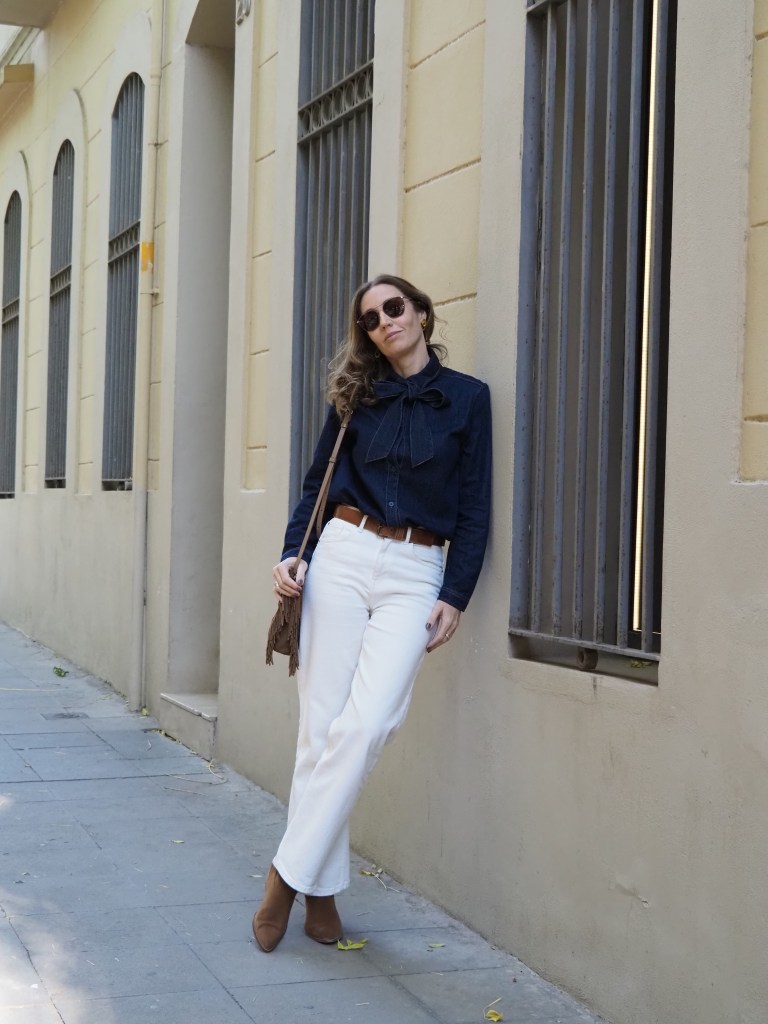 En mi caso es una camisa de tejido denim azul oscuro y me encanta cómo queda combinada para otoño con jeans de color blanco roto y complementos en marrón.