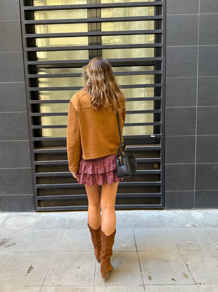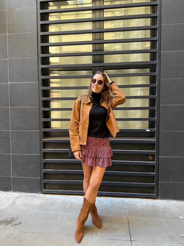 El estilismo está formado por una mini falda de doble volante en la que predomina el tono burgundy o granate, un jersey negro con detalle de volante en hombros y puños, chaqueta de ante, botas cowboy, y bolso negro para romper con la tonalidad marrón de botas y chaqueta.