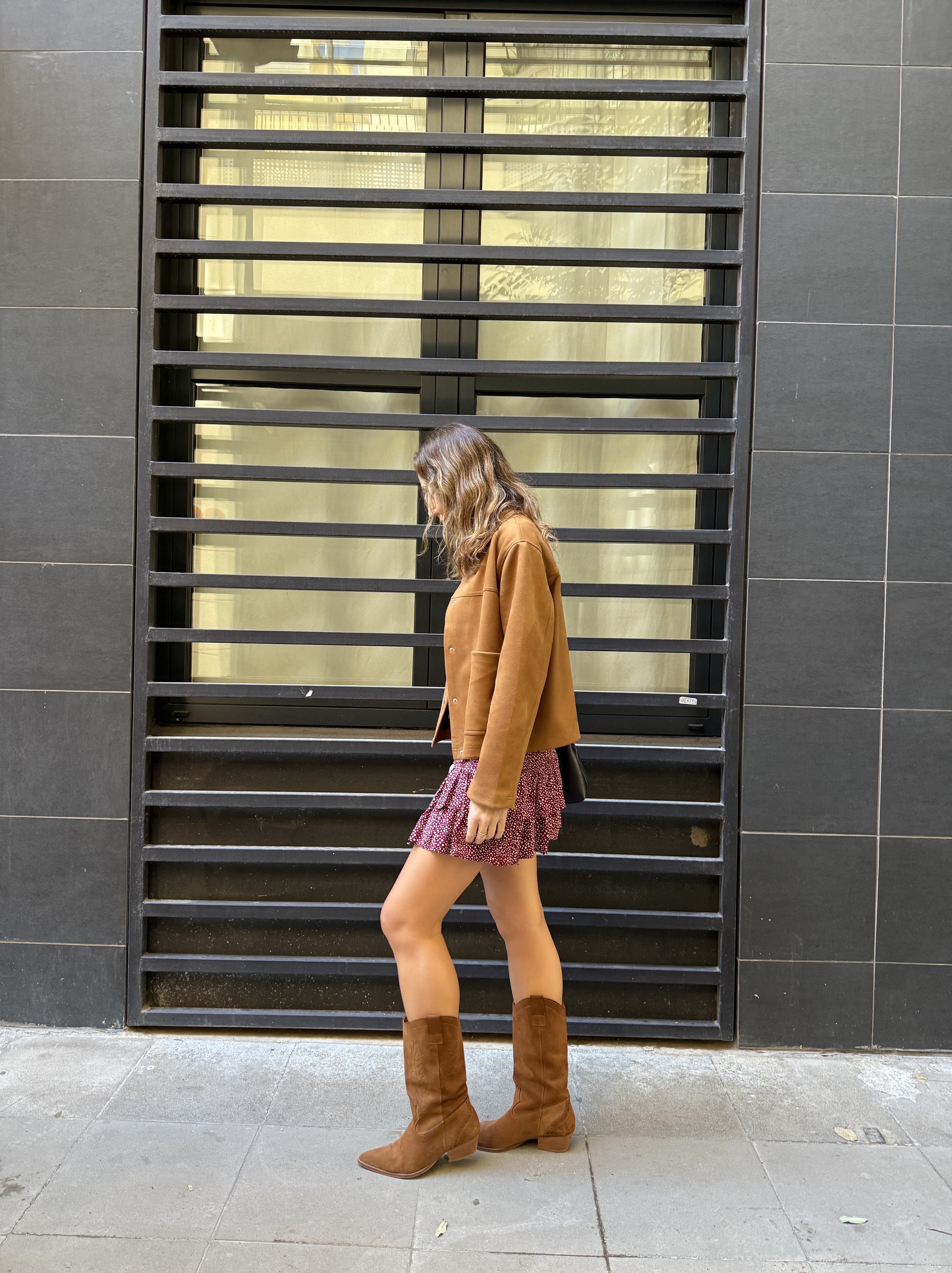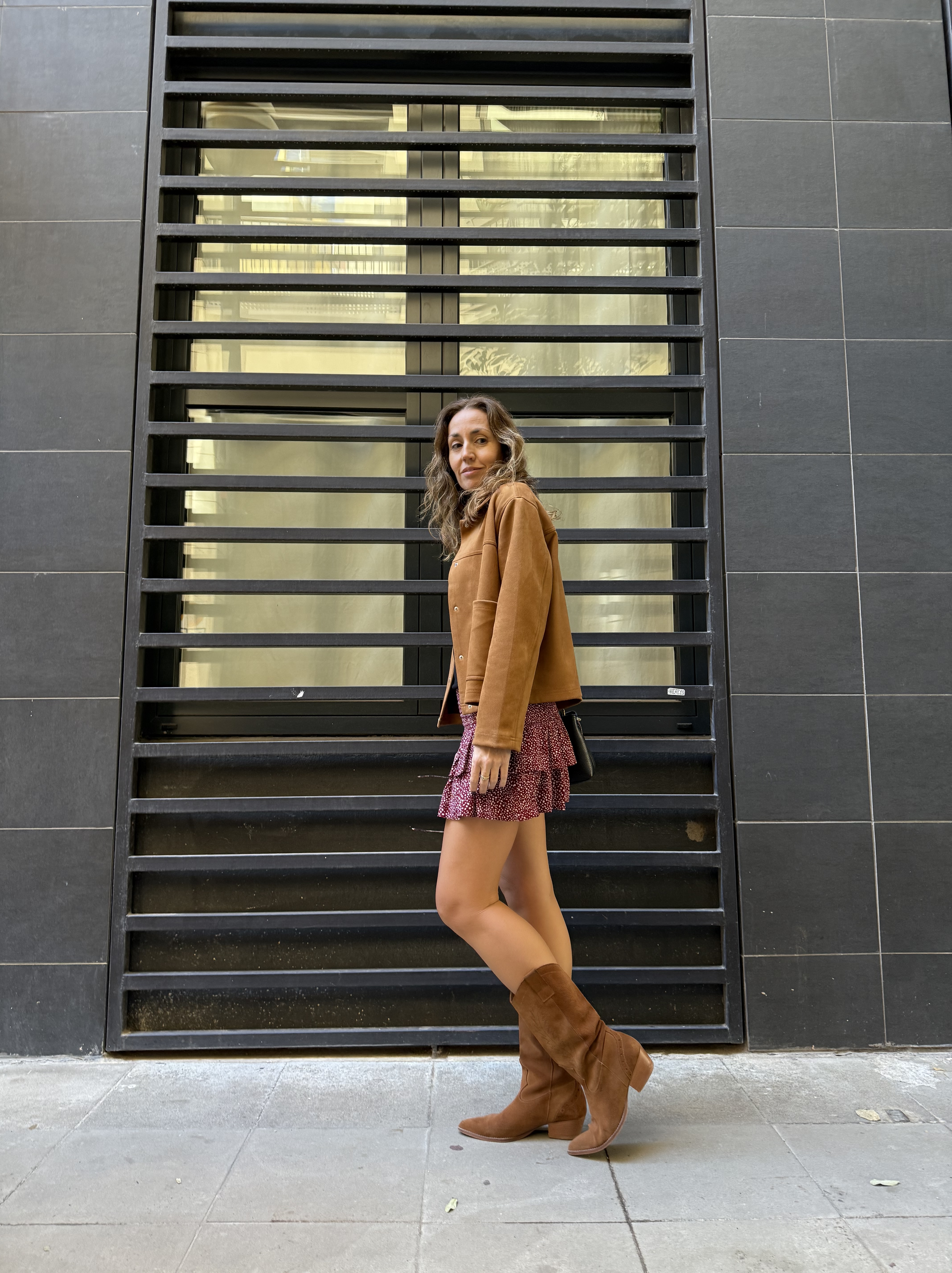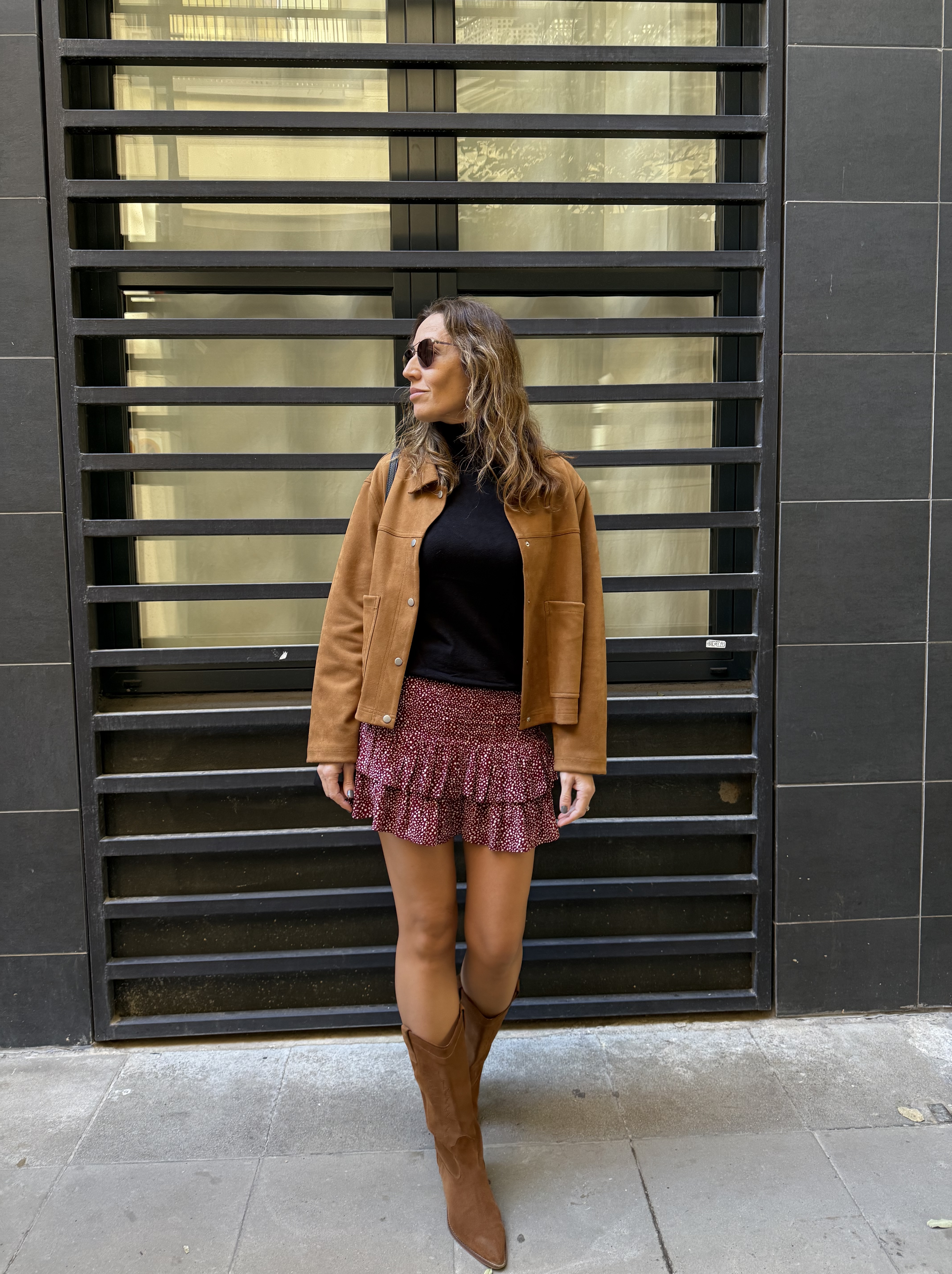 El estilismo está formado por una mini falda de doble volante en la que predomina el tono burgundy o granate, un jersey negro con detalle de volante en hombros y puños, chaqueta de ante, botas cowboy, y bolso negro para romper con la tonalidad marrón de botas y chaqueta.