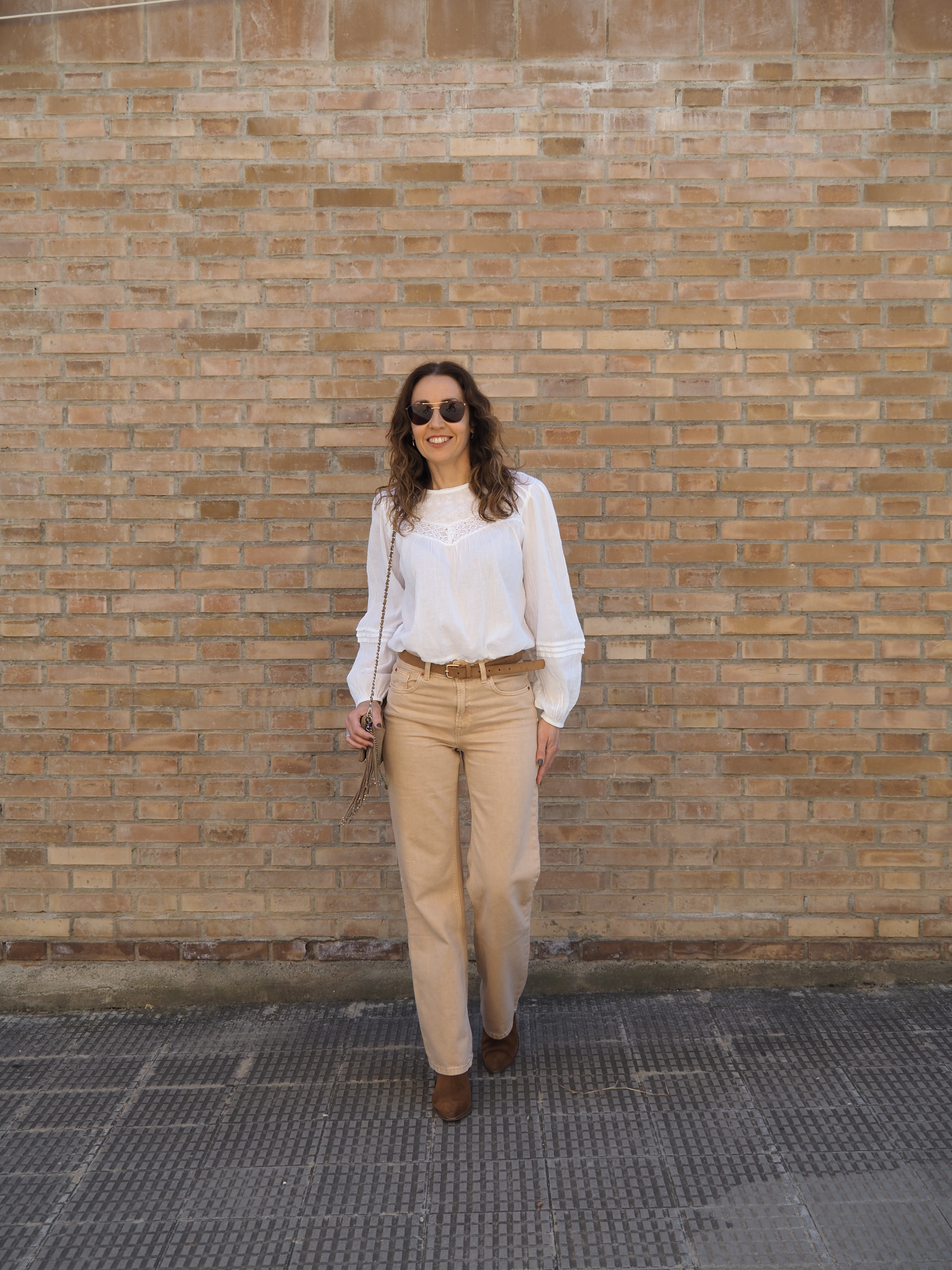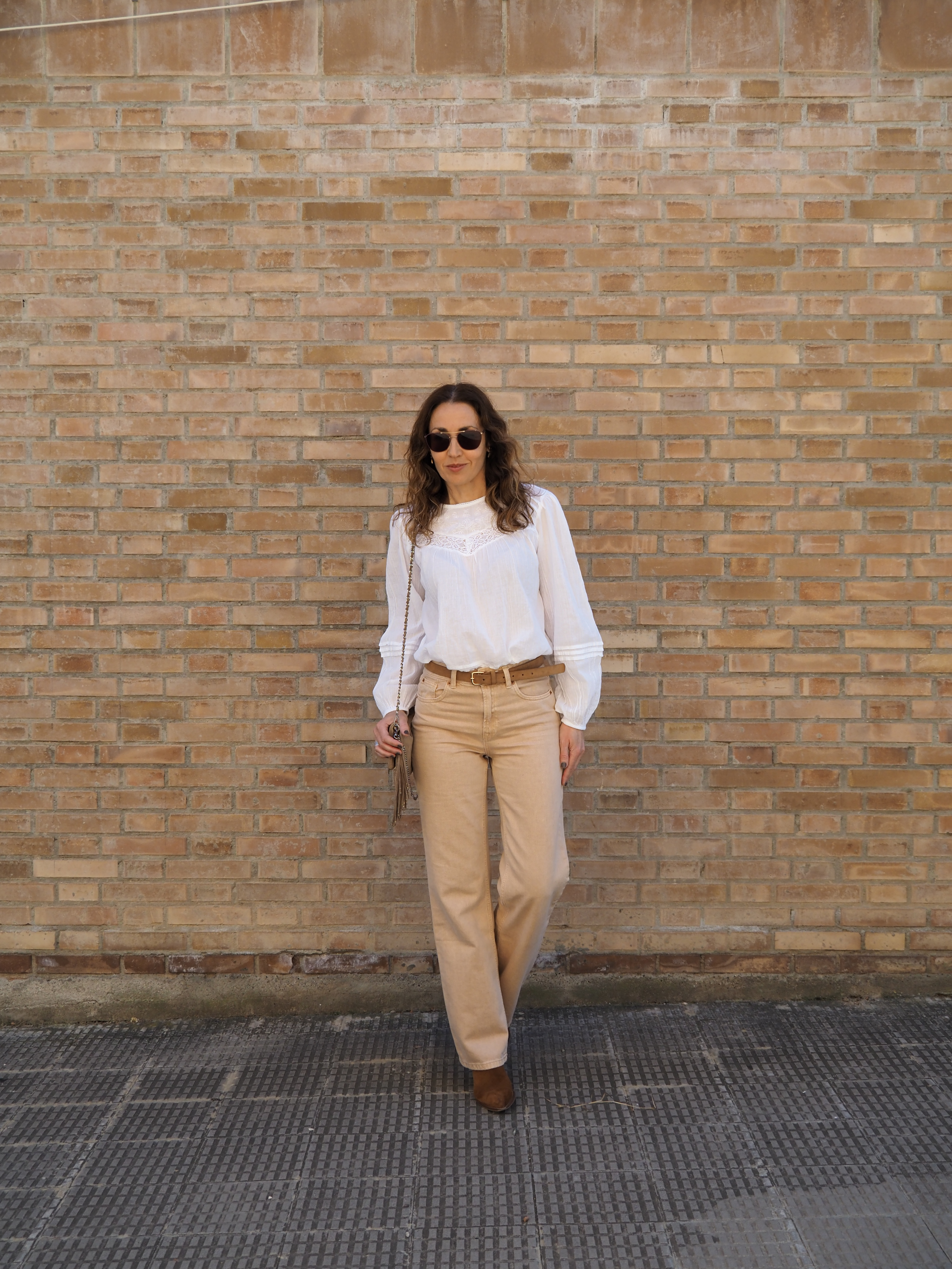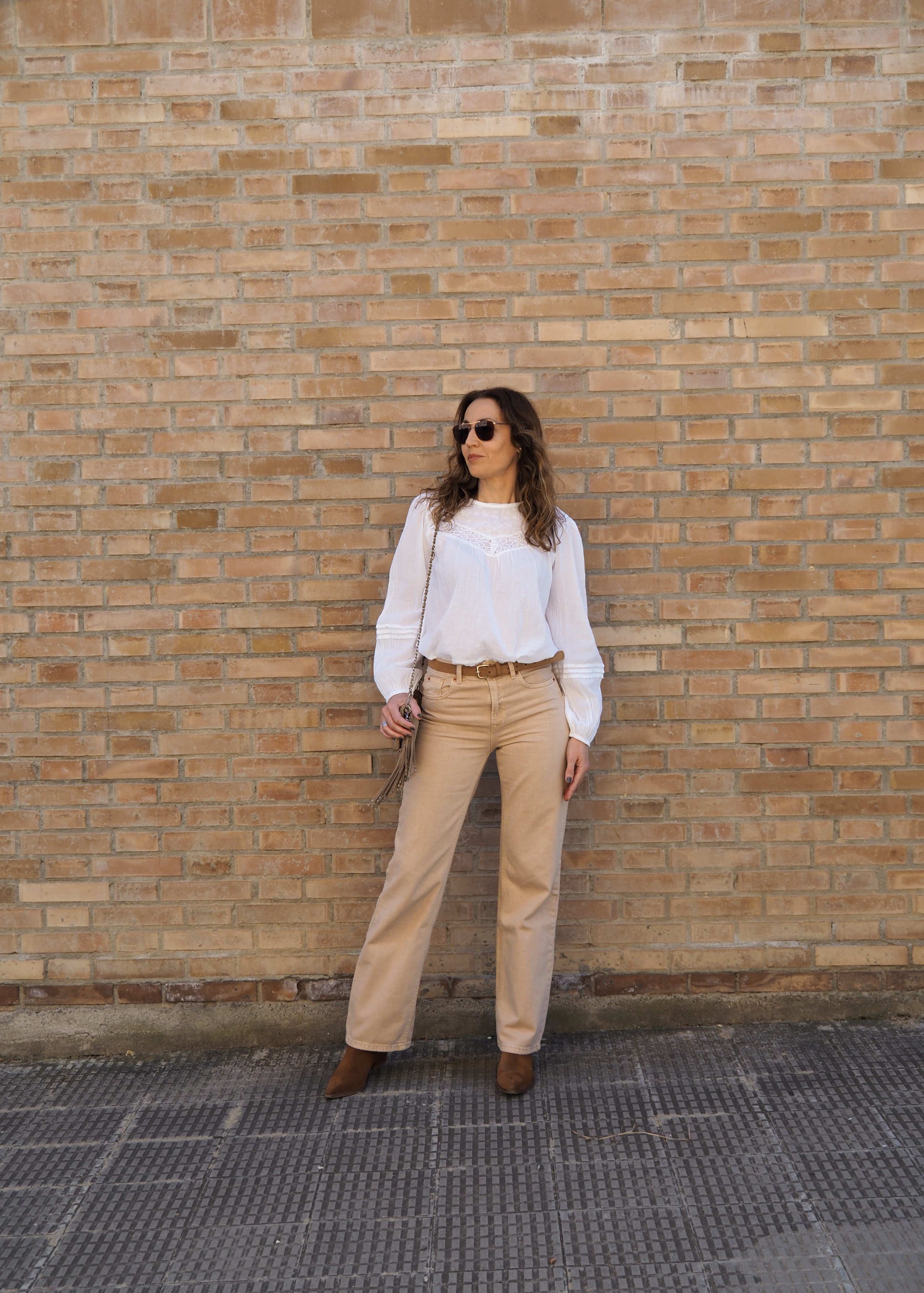 ¡Hola! En este post comparto un outfit de la semana pasada cuyo protagonismo recae en la blusa blanca de estilo boho, que es otra de las tendencias de esta primavera. Es un look muy sencillo formado por vaqueros en color ocre o amarillo tostado, botas cowboy y mini bolso de flecos. Un ejemplo perfecto del menos es más, ¿no crees?